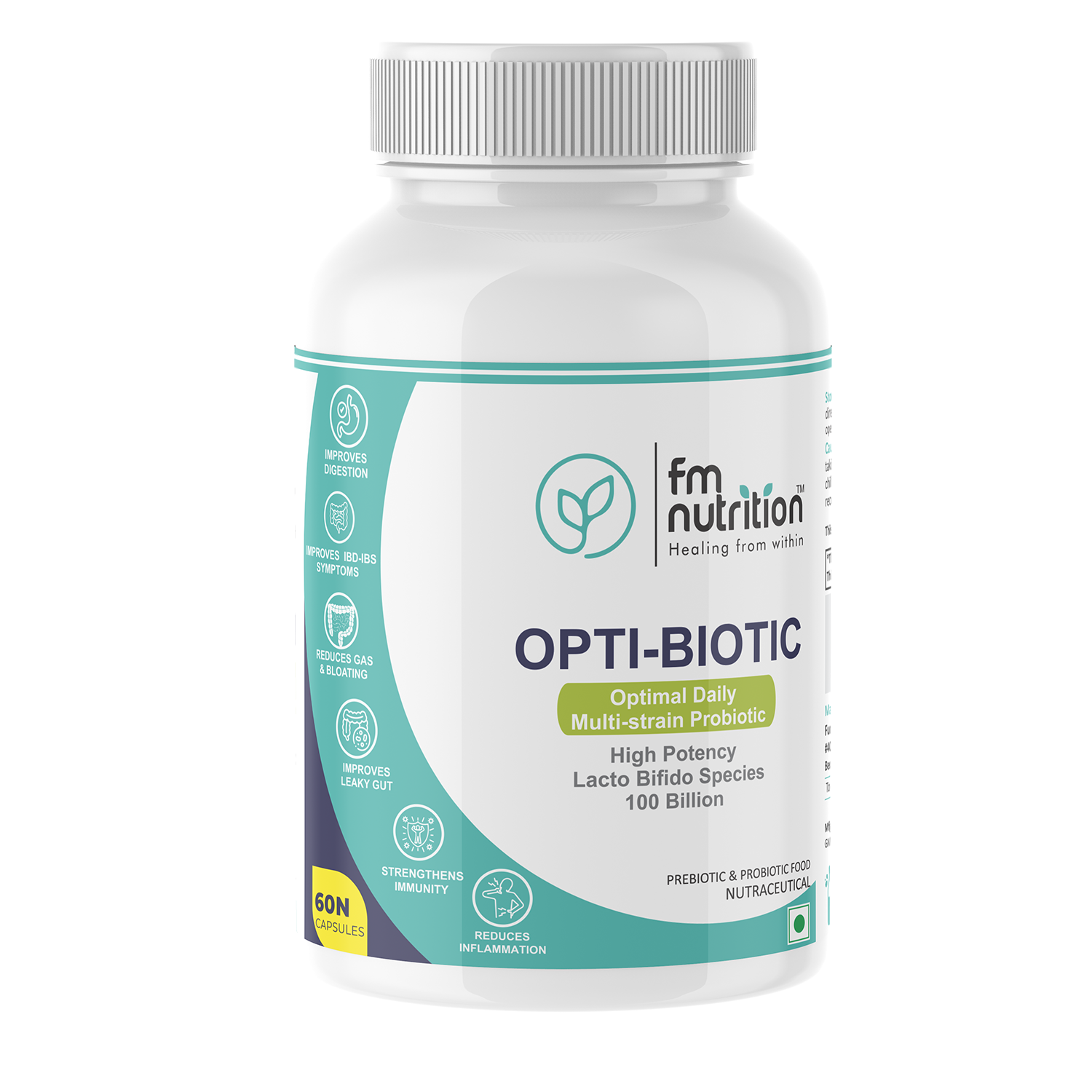 FMN Opti-Biotic is a multi-strained Probiotic formula designated to support your Gut Health. It promotes Digestive Comfort, restores Gut Balance and enhances Immune Function.