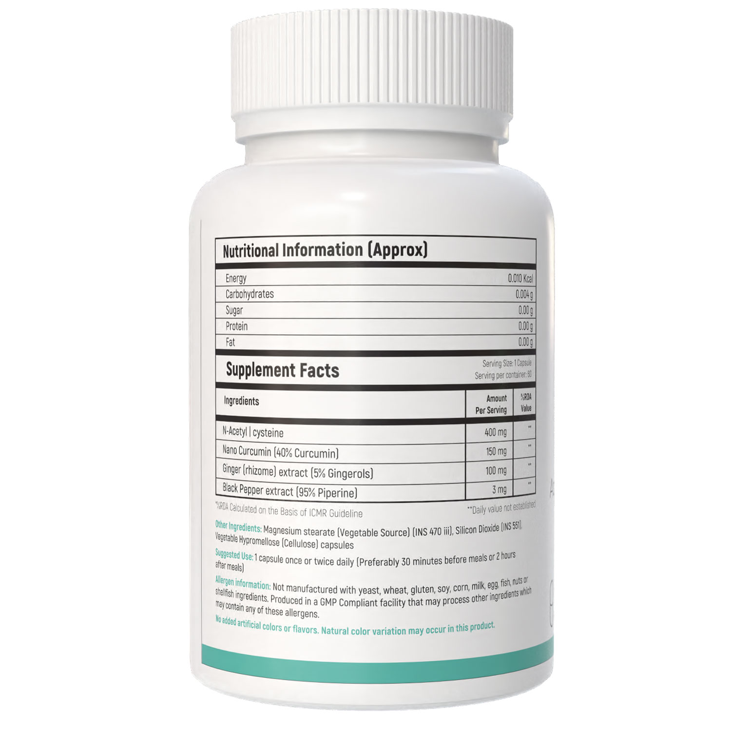 - Clean, High-Absorption N-Acetyl Cysteine Supplements – Made with NAC 600mg, high-absorption curcuminoids & ginger extracts. Free from gluten, soy & artificial additives. A complete glutathione supplement + antioxidant supplements combo for daily health.