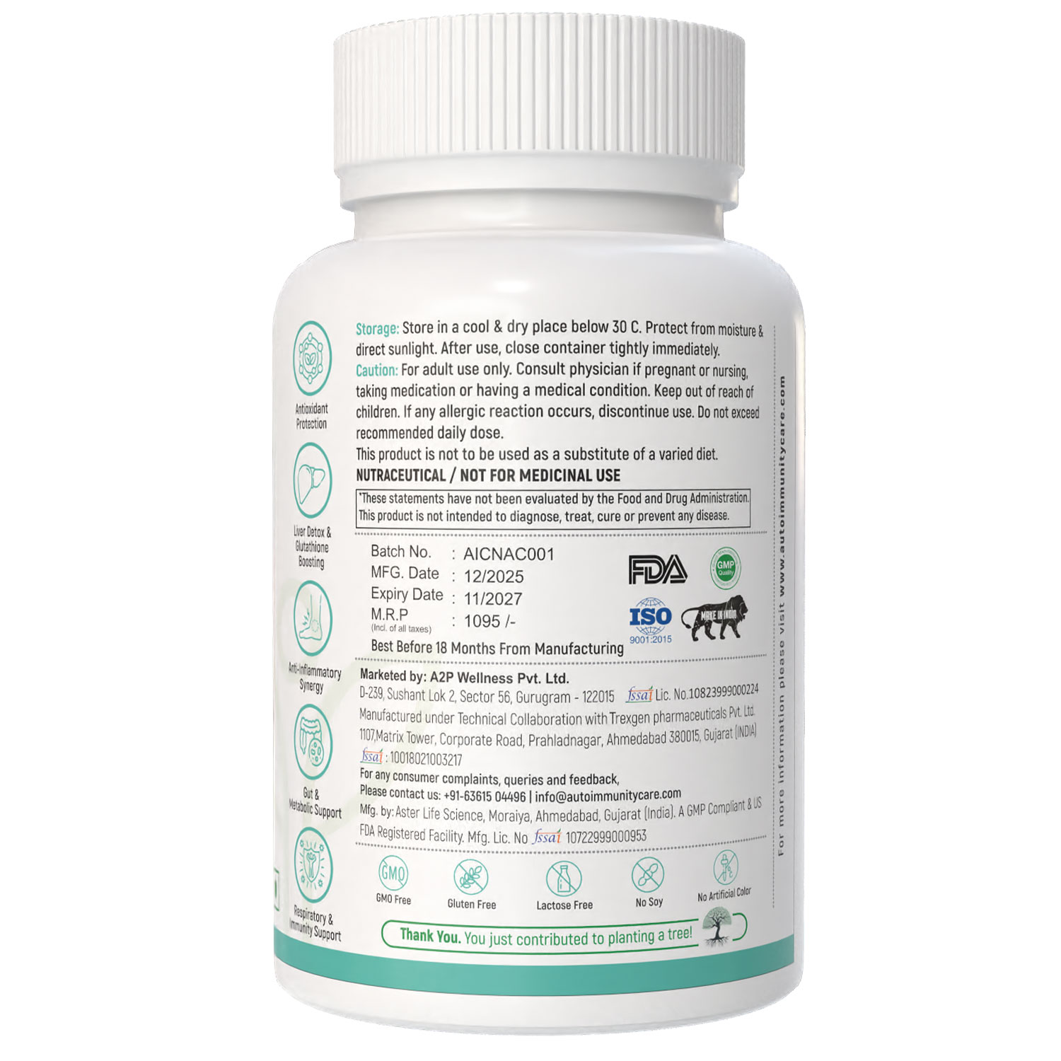 Autoimmunity Care NAC+ Care is a powerful daily antioxidant and anti-inflammatory formula combining N-Acetyl-L-Cysteine (NAC), bioavailable curcumin, ginger extract and piperine to support glutathione levels, cellular protection, liver function and overall wellness.- Boosts Glutathione & Cellular Protection – This powerful NAC supplement (N acetyl cysteine) helps increase the body’s master antioxidant glutathione, protecting cells from pollution, stress, toxins & aging. Ideal antioxidant supplement for daily defense.