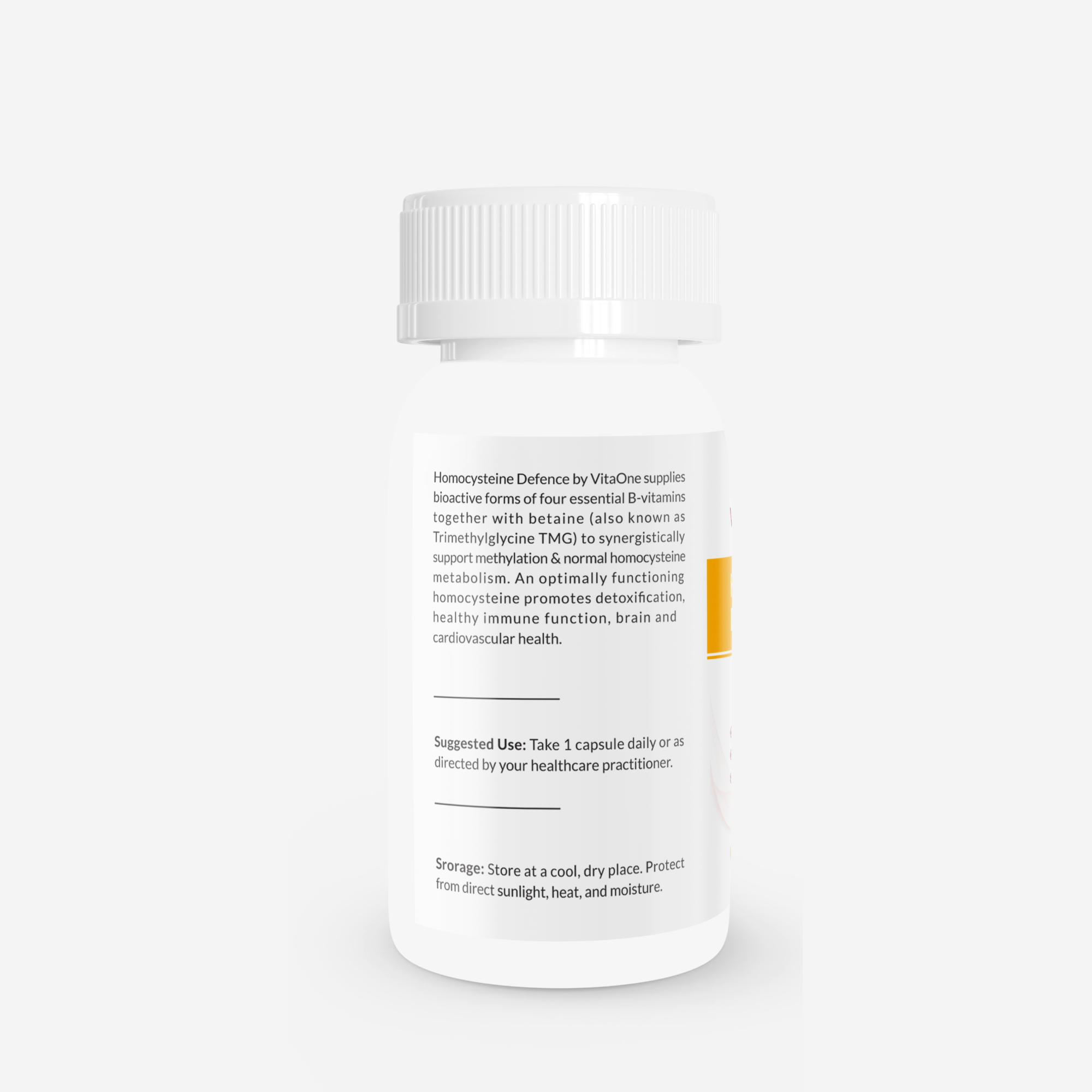Homocysteine Defence by VitaOne provides a unique combination of bioactive B-vitamins and betaine to support methylation processes and healthy homocysteine metabolism. This bioactive B complex is formulated to address vitamin B deficiencies and promote overall wellness. Elevated homocysteine levels have been linked to cardiovascular risks, underscoring the importance of folate in homocysteine metabolism. The active form of folate, 5-Methyltetrahydrofolate (5-MTHF), can be particularly beneficial for individuals with high homocysteine levels, aiding in cardiovascular health and overall vitality. Benefits and Applications:- Homocysteine Support: 5-MTHF is crucial for homocysteine metabolism, effectively reducing elevated levels and lowering cardiovascular risk.